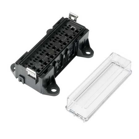 The 7-way micro relay holder is ideal for protecting relays against dust, debris and liquids that can hinder relay performance. The relay block allows for a professional installation where multiple micro relays can be mounted cleanly. The 7-way mini relay holder block kit includes everything needed for immediate installation, just add up to seven micro style relays. To install, crimp the terminals provided in the kit to 14 or 16 ga wire. Insert the crimped wires into the bottom of the block. Place the bottom cover on. Mount the block. The mounting feet are adjustable and removable. Place the TPAs into the top of the block and then add the micro relays. Place the cover over the top.