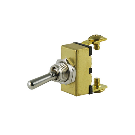 Description: This brass toggle switch features an all brass construction with copper rivets for optimum conductivity. A brass toggle switch are commonly used as boat switches, but can be used for other watercraft and harsh environment applications.