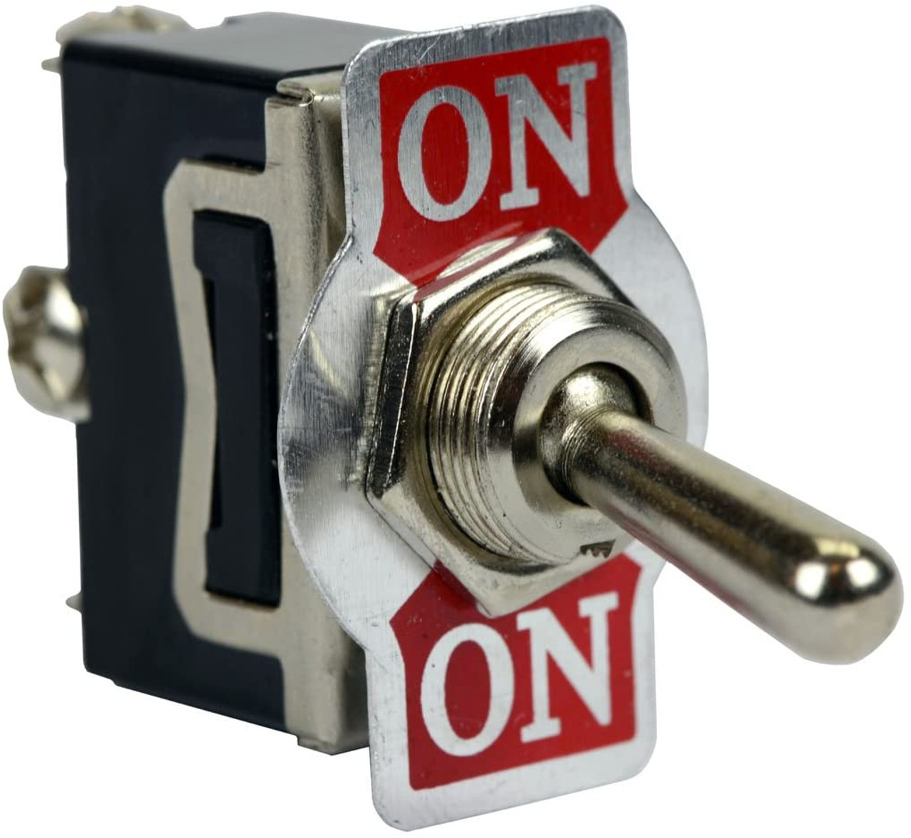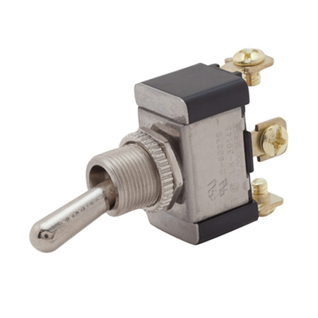 Description: These heavy-duty toggle switches feature screw terminals and are available in four different actuations; SPST, SPDT, DPST and DPDT. Screw terminal heavy duty toggle switches meet the standards of today's automotive, marine and industrial applications, and are great for electrical connections that require a high amp switch. The toggle switches are created with brass terminals, steel with zinc chromate frame and support, and brass/bright nickel external parts. The switch features a black phenolic plastic case with a flammability rating of UL 94 flame class 94V-1.
