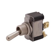 These heavy-duty toggle switches feature screw terminals and are available in four different actuations; SPST, SPDT, DPST and DPDT. Screw terminal heavy duty toggle switches meet the standards of today's automotive, marine and industrial applications, and are great for electrical connections that require a high amp switch. The toggle switches are created with brass terminals, steel with zinc chromate frame and support, and brass/bright nickel external parts. The switch features a black phenolic plastic case with a flammability rating of UL 94 flame class 94V-1.