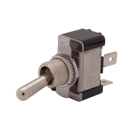 Description: These heavy-duty toggle switches feature flat terminals and are available in four different actuations; SPST, SPDT, DPST and DPDT. Flat terminal heavy duty toggle switches meet the standards of today's automotive, marine and industrial applications, and are great for electrical connections that require a high amp switch. The toggle switches are created with brass terminals, steel with zinc chromate frame and support, and brass/bright nickel external parts. The switch features a black phenolic plastic case with a flammability rating of UL 94 flame class 94V-1.